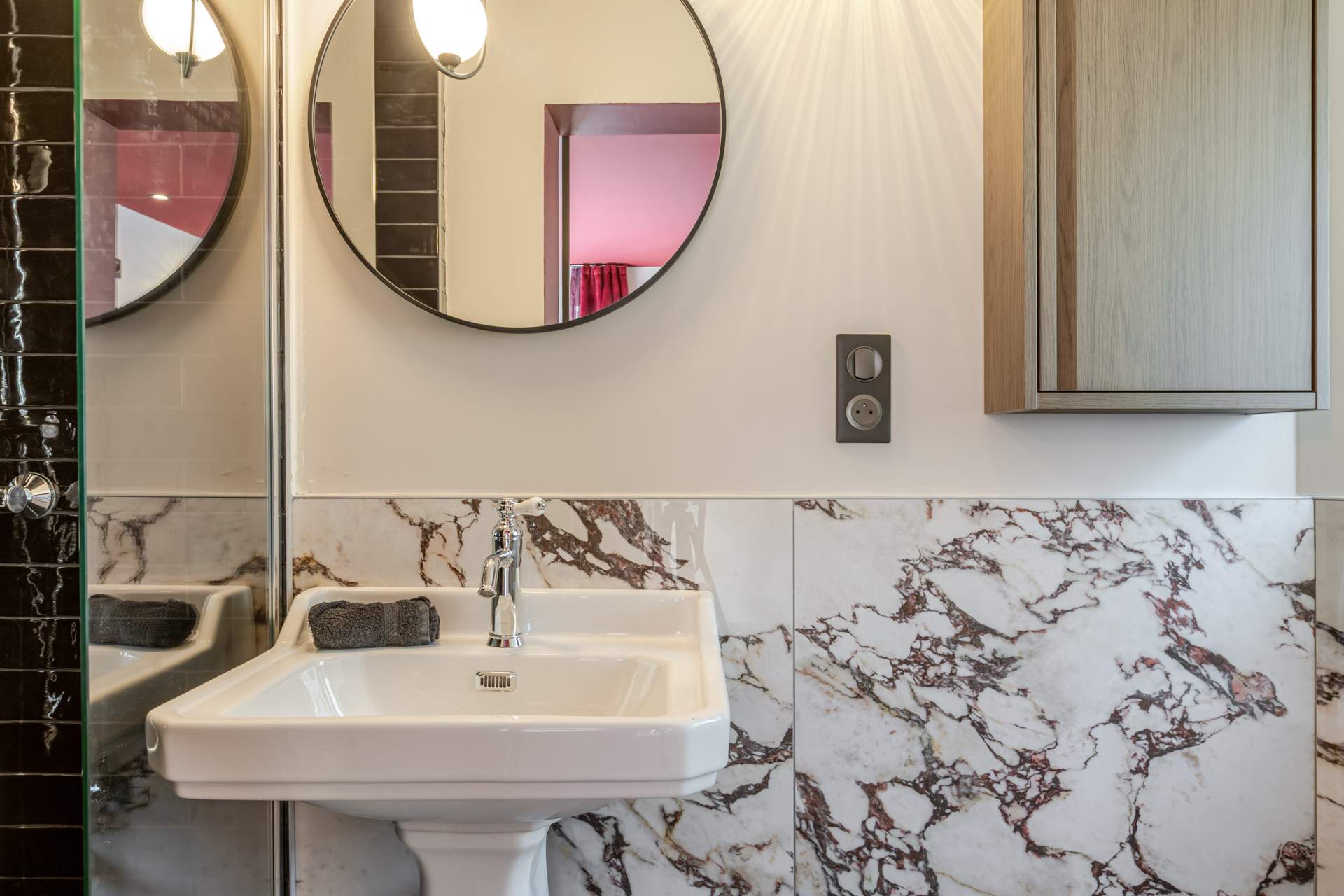 Inspirée par une ambiance de boudoir chic et glamour, notre suite avec spa de 40 m², à 45 minutes de Strasbourg, à Niederbronn-les-Bains a été conçue comme un véritable sanctuaire pour les couples. La décoration, dans des tons bordeaux, mêle motifs baroques et ambiance feutrée pour créer un cocon de passion et de complicité. Pour vos soirées, un téléviseur 55 pouces connecté et une barre de son Bluetooth sont à votre disposition.